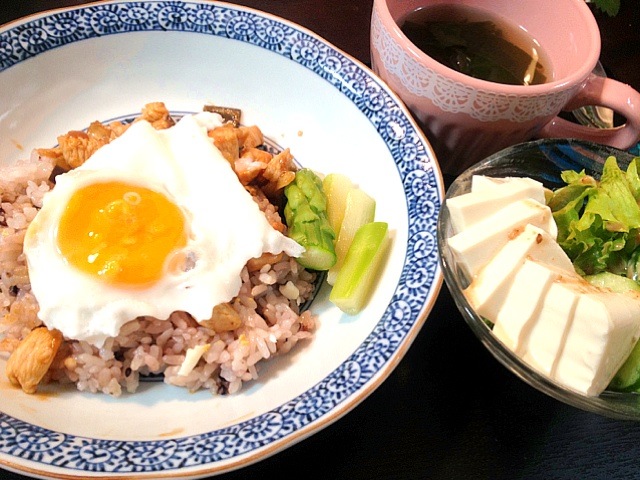 夕ご飯 和風ガパオ 鶏むね肉 玉ねぎ 我が家の茄子 ダークオパールバジル 雑穀米茹でアスパラガス 豆腐のサラダ レタス 我が家の胡瓜わかめスープ Piyoko Snapdish スナップディッシュ Id Dhhrsa
